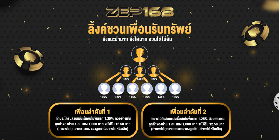 สำหรับผู้เล่นที่ชอบแนะนำเพื่อน ทาง ZEP168 ก็มีโปรแกรมพันธมิตรที่ให้ค่าคอมมิชชั่นสูงถึง 0.5% จากยอดเล่นของเพื่อนที่แนะนำมา โดยไม่มีเพดานจำกัด ยิ่งแนะนำมากก็ยิ่งได้รับผลตอบแทนมาก